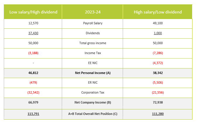 - A high salary/low dividend strategy would result in lower net personal income (A) of £38,342 but the company will pay a lower rate of corporation tax and therefore retain a higher level of profits being £72,938 (B).
