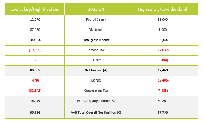 For the tax year 2023/24, we would recommend that those who have previously operated a low salary / high dividend strategy, continue doing the same as this will maintain a similar net income for you personally as in previous years.